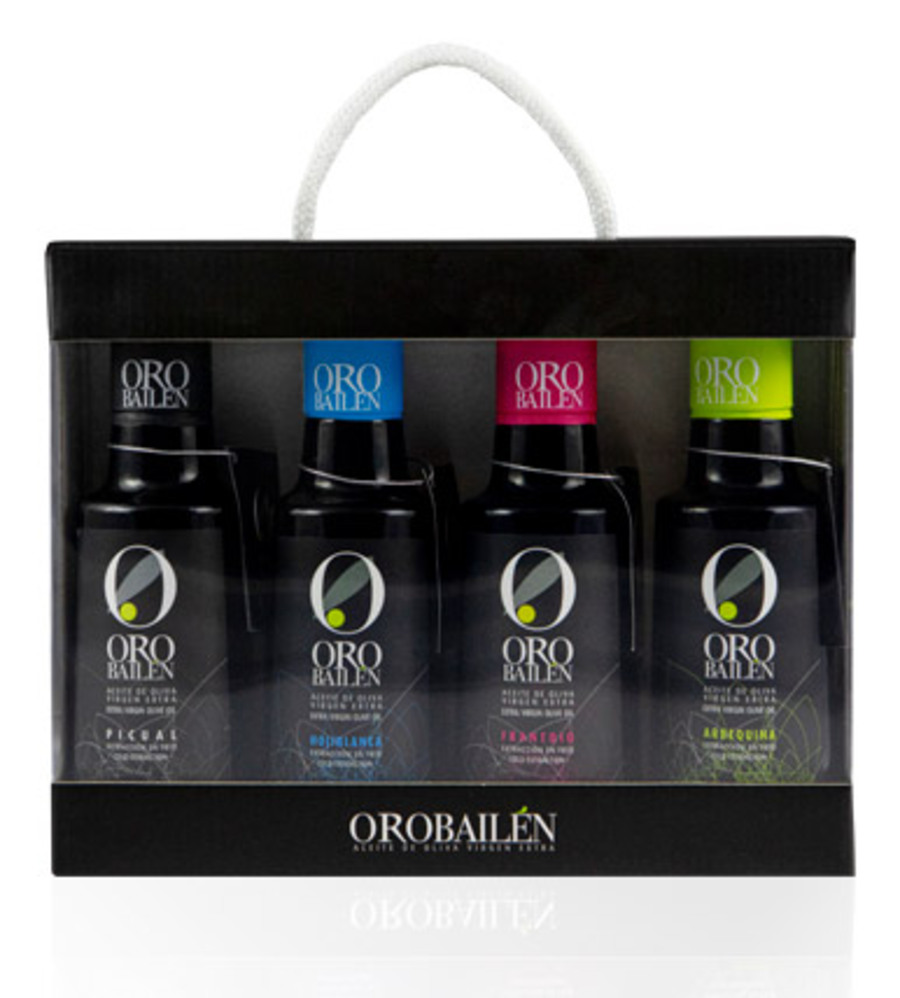 Aceite de oliva virgen Extra Oro de Bailén. Estuche regalo que contiene 4 botellas de 250 ml, de las variedades: Picual, Hojiblanca, Frantoio y Arbequina.
